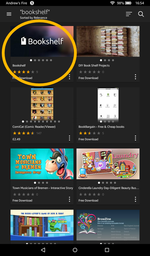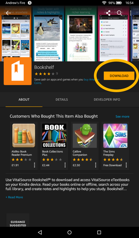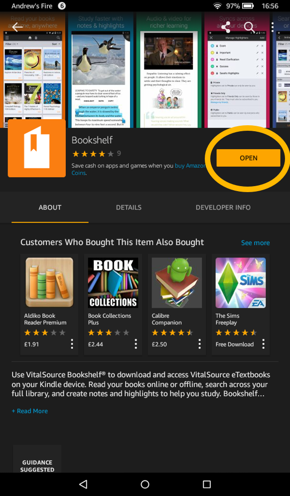 Search for “bookshelf” in the Kindle app market and click the “Bookshelf” app (from Vitalsource)